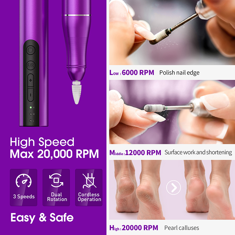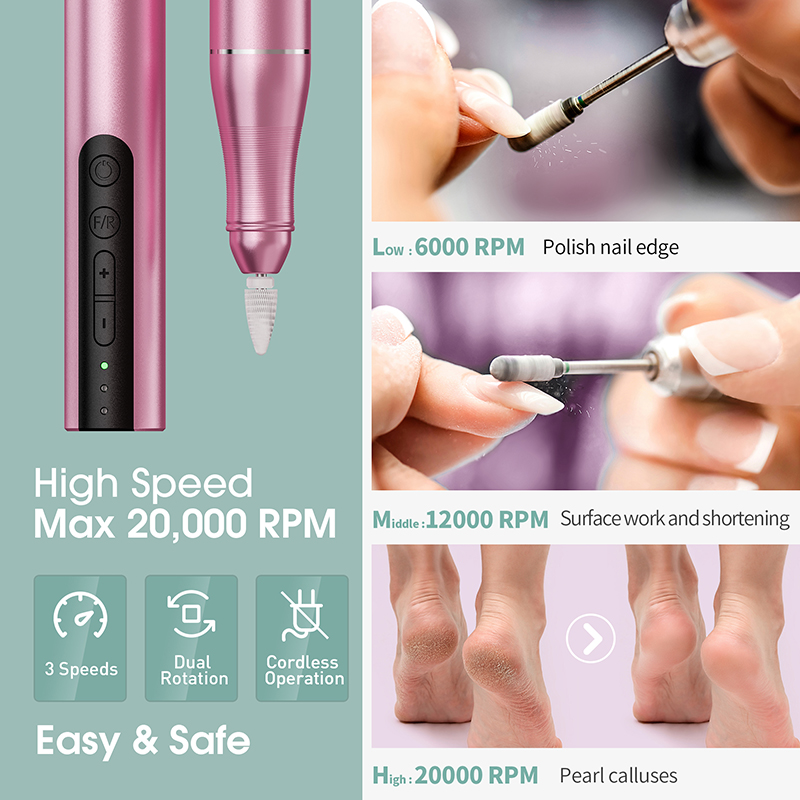 קבצי ציפורניים מקצועיים מתוכננים עם 3 מהירויות של 6000-12000-20000, פשוט לחיצה קצרה על כפתור + או - כדי להגביר או להקטין את המהירות. קל להתאים את המהירות ולחסוך זמן בעת השחזת ציפורניים. ניתן לשנות את כיוון המקדחה בקלות על ידי לחיצה על כפתור ה-F/R, אידיאלי עבור אנשים שמאליים, אומני ציפורניים אומנים מתחילים לטיפוח ציפורניים.