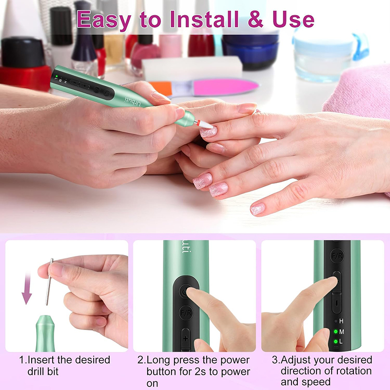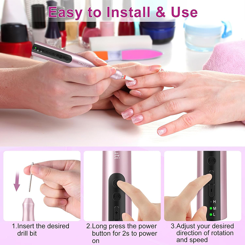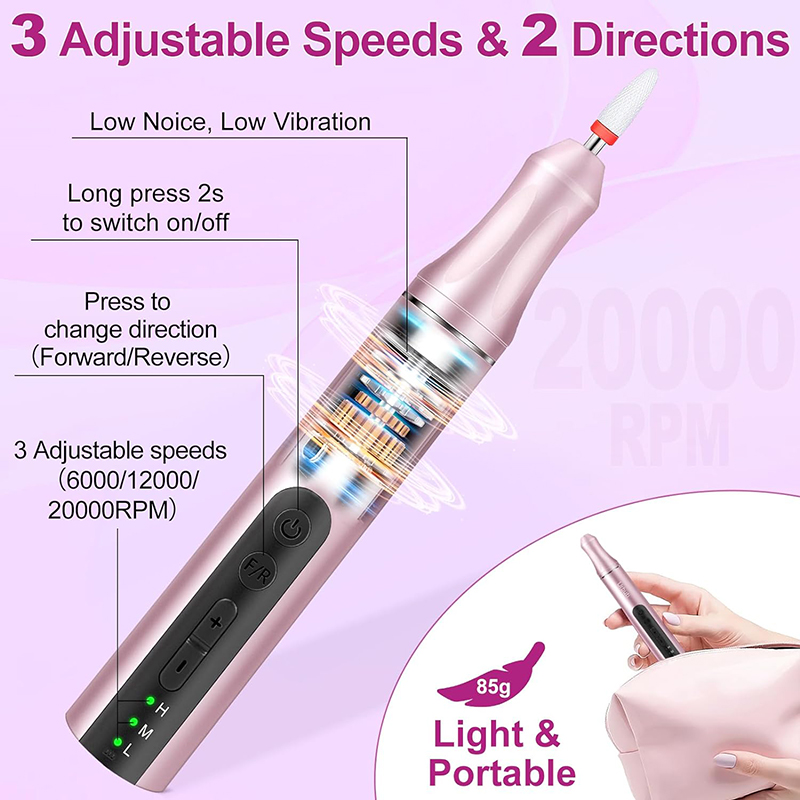 קבצי ציפורניים מקצועיים מתוכננים עם 3 מהירויות של 6000-12000-20000, פשוט לחיצה קצרה על כפתור + או - כדי להגביר או להקטין את המהירות. קל להתאים את המהירות ולחסוך זמן בעת השחזת ציפורניים. ניתן לשנות את כיוון המקדחה בקלות על ידי לחיצה על כפתור ה-F/R, אידיאלי עבור אנשים שמאליים, אומני ציפורניים אומנים מתחילים לטיפוח ציפורניים.