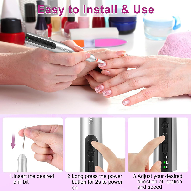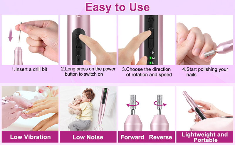 מקדחה חשמלית לציפורניים זו כוללת את גוף האלומיניום העדכני ביותר עם עיצוב נגד רטט, שיכול להפחית ביעילות את הרעש והחום בעת שחיקת ציפורניים, מה שמבטיח שלא תפריע לאף אחד בזמן ליטוש הציפורניים. המראה הארגונומי של העט גורם לאחיזה נוחה ללא החלקה ומאפשר לך להסיר ציפורניים ג'ל בקלות.