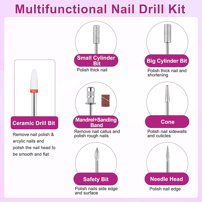 מכונת מקדחה לציפורניים כוללת 6 מקדחי ציפורניים מנירוסטה, מקדחה קרמית אחת ו-36 פסי שיוף מתחלפים. ערכת פדיקור מניקור יכולה לשמש למניקור, פדיקור, ליטוש, עיצוב, שחיקת קוטיקולה, הסרת ציפורניים באקריליק/ג'ל, או ליופי ציפורניים. שלם עם אביזרים וקל לשימוש, מושלם למתחילים באמנות ציפורניים!