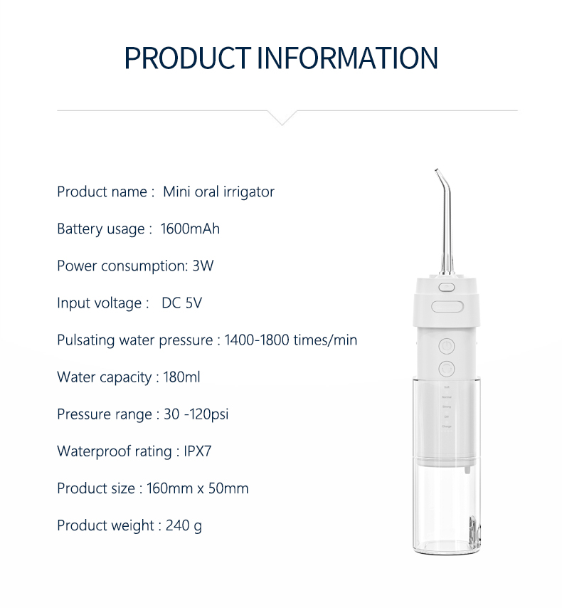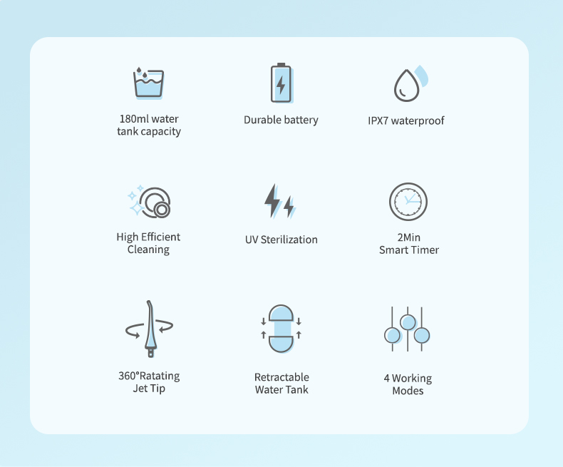 אוסף השיניים בחוט מים זה מספק פעימות לחץ מים גבוהות בקצב של 1400-1800 פעמים בדקה, ומסיר ביעילות 99.9% מהרובד הדנטלי לניקוי שיניים עמוק. מרים זה מעסה את החניכיים, מקדם את זרימת הדם ומטפל בבעיות פה כמו ריח רע מהפה, שיניים אורתודונטיות