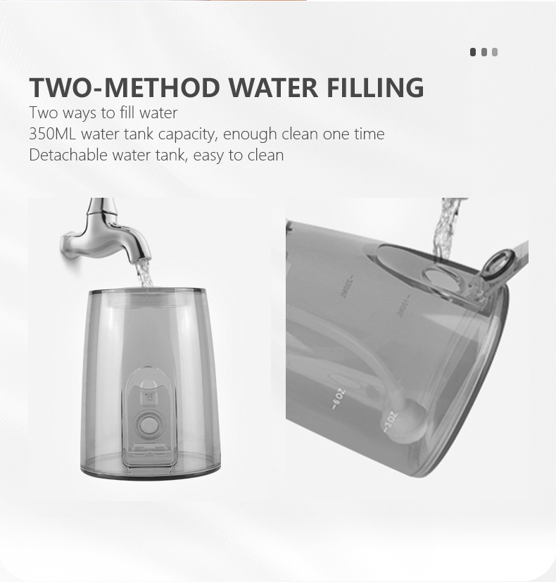 חוט דנטלי מים זה כולל מיכל מים משודרג של 350 מ"ל, קיבולת כפולה מדגמים ישנים אחרים, מבטל את הצורך במילוי תכוף והופך את ניקוי הפה שלך לנוח ויעיל יותר.