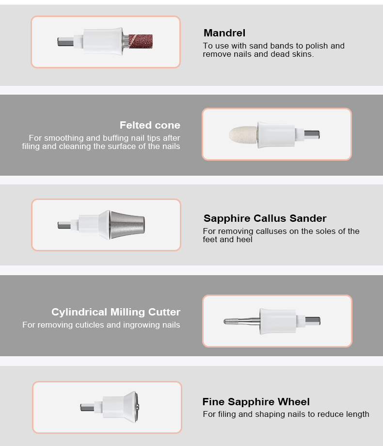 - סט ציפורניים בן 32 חלקים: הפצירה החשמלית הניידת Pro מגיעה עם 8 מקדחי ציפורניים מובחרים, 20 רצועות שיוף וקופסת אחסון מגנטית לארגון קל. בנוסף, מסופק מגן אבק מגן כדי לשמור על היגיינה ולהבטיח חווית מניקור ופדיקור ללא בלגן