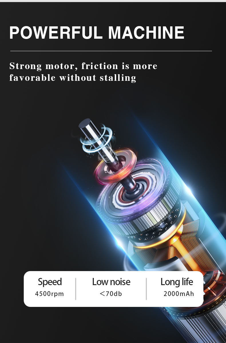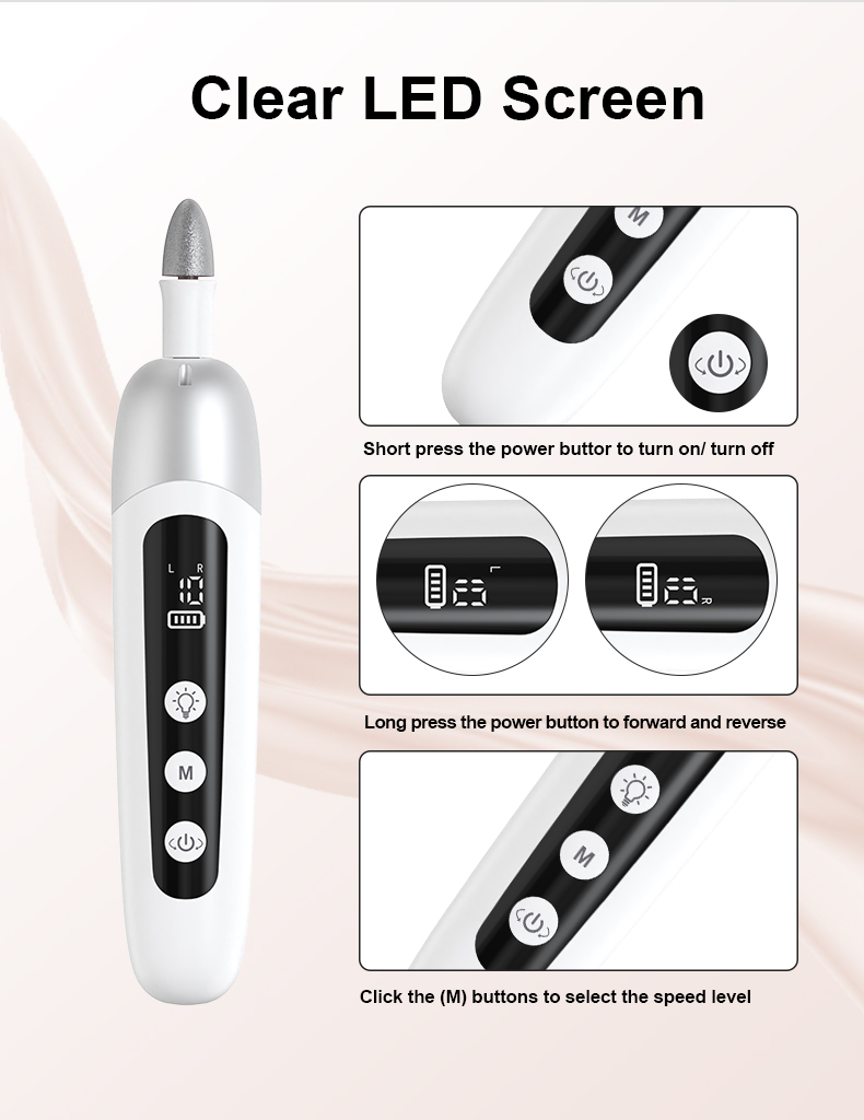 - תצוגת LED חדשנית: נווט בצורה חלקה בהגדרות הרצויות בקלות. תצוגת LED מציינת את מצב הסוללה, העדפת מהירות והגדרות סיבוב לפעולה ללא מאמץ. מכונת הפצירה החשמלית מצוידת גם במנורת LED משולבת המאירה אזורים בידיים וברגליים