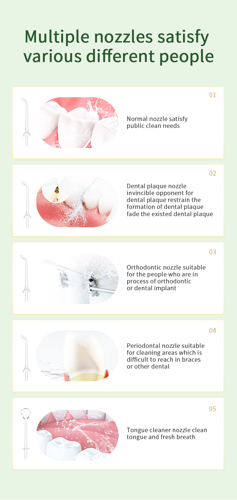 מרים שיניים מים זה מספק פעימות לחץ מים גבוהות בקצב של 1400-1800 פעמים בדקה, ומסיר ביעילות 99.9% מהרובד הדנטלי לניקוי שיניים עמוק. מעסה שיניים מים זה מעסה את החניכיים, מקדם את זרימת הדם ומטפל בבעיות פה כמו ריח רע מהפה, שיניים יישור שיניים